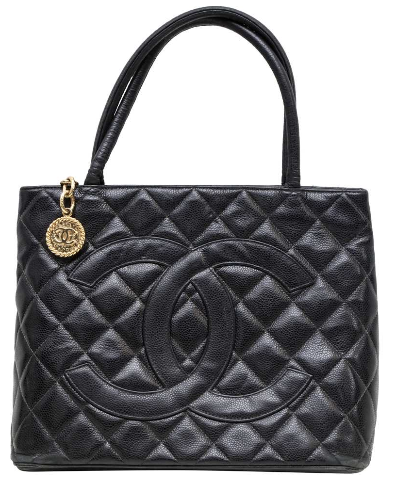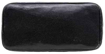 Ce sac fourre-tout structuré est fabriqué en cuir caviar matelassé noir. Il est orné d'un grand logo CC embossé sur le devant, de fines poignées en cuir roulées et d'une tirette de fermeture à glissière en médaillon CC doré. L'architecture comprend une poche arrière plaquée et un intérieur doublé de cuir avec deux poches internes.