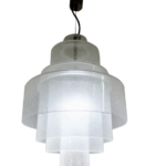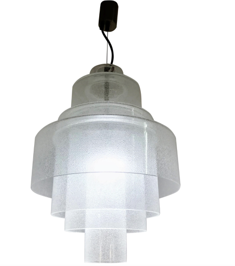 Magnifique et rare suspension moderne du milieu du siècle, le lustre LS-120, conçu par Carlo Nason pour Mazzega à Murano, en Italie, vers 1960. Il s'agit de la grande version à quatre éléments empilés (contrairement à la version plus petite à trois niveaux). Il est fabriqué à partir de verre Pulegoso épais et texturé, connu pour sa texture opaque due à des bulles d'air internes contrôlées.