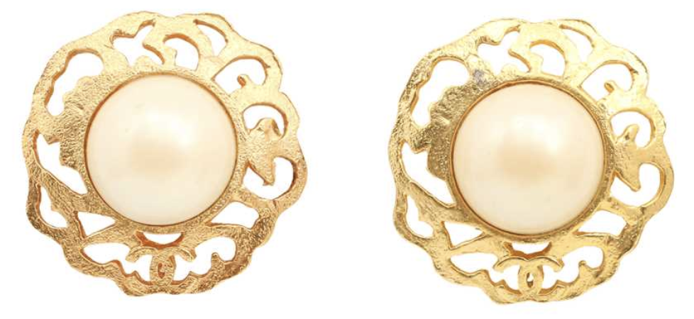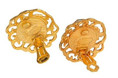 A pair of circular clip-on earrings featuring a large central ivory-toned imitation pearl. The setting is composed of a textured, "Baroque" gold-tone metal frame with a signature interlocking CC logo at the center of the pearl. The reverse is fitted with a traditional clip-on mechanism and bears the house's oval authenticity stamp.