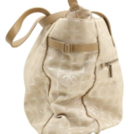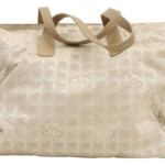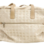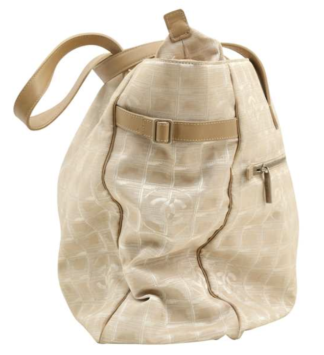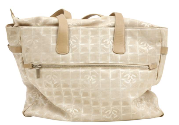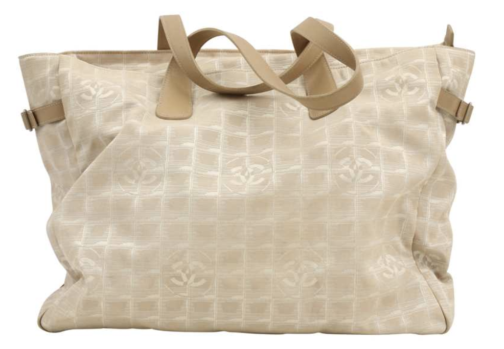 A large-format 'New Travel Line' shoulder tote, executed in beige and cream nylon jacquard with a repeating tonal CC grid motif. The structure includes dual flat leather top handles, a zippered closure, and a protective reinforced base. The interior is lined in tonal textile and features two internal zippered security pockets.