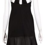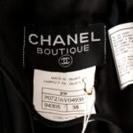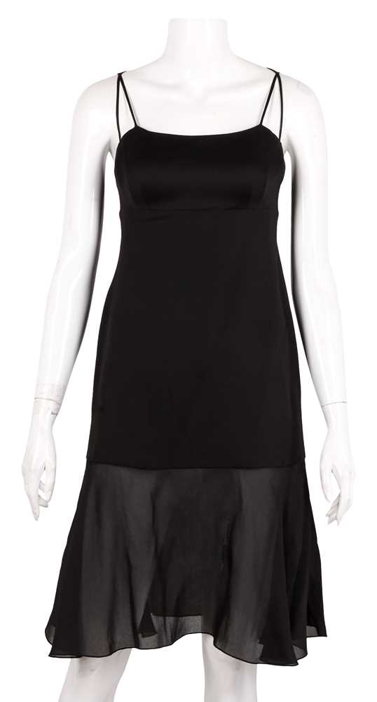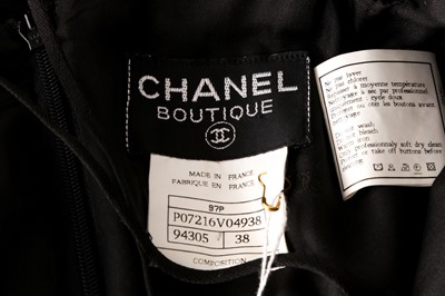 A mid-length cocktail dress constructed from delicate black silk tissue. The architecture is defined by its translucent volume and is secured by signature resin and gold-tone CC buttons. Labelled as a size 38 and originating from the house’s 1997 collection.