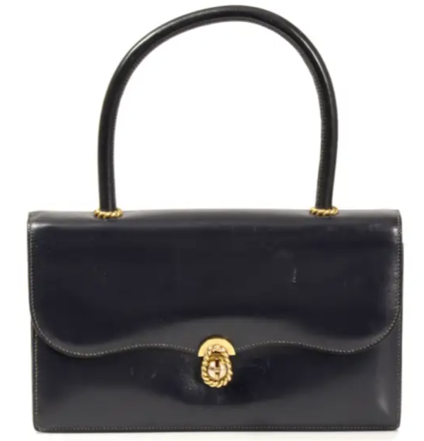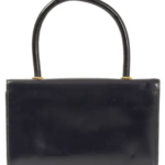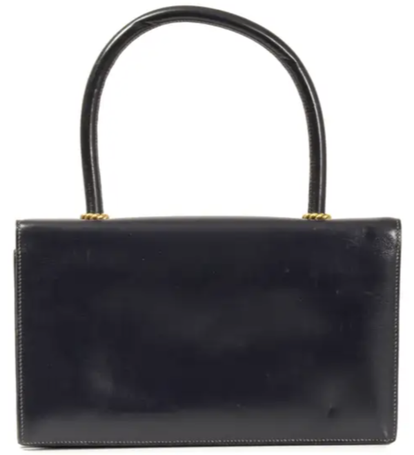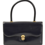 A vintage top-handle bag in navy box leather with a curved flap and semi-rigid handle. Features a gold-plated hardware clasp and a leather-lined interior with three compartments and a lipstick pocket.