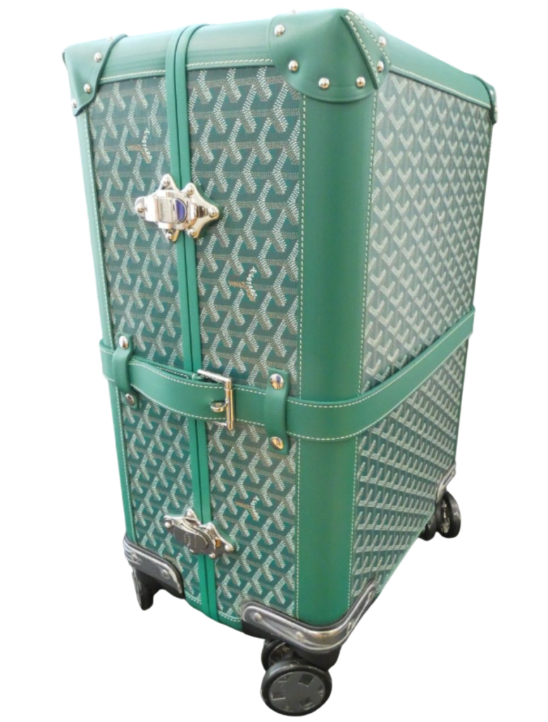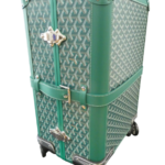The Goyard 'Bourget' Suitcase blends classic trunk design with modern functionality. Crafted from durable Goyardine Canvas and Clamecy Cowhide, it features palladium jewelry (2 trunk clasps and lockable strap), internal security compartments, elastic support straps, and a yellow cotton lining. Designed for discerning travel, it includes leather carrying handles, a telescopic aluminium handle, trunk-style leather corners, and 360-degree rotative wheels.