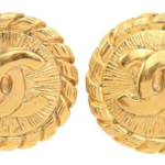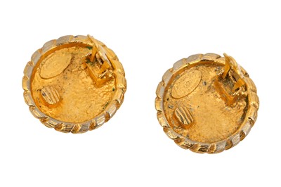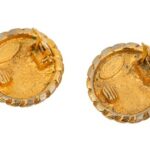 A pair of vintage Chanel clip-on earrings featuring the interlocking CC logo set within a circular frame. The design is distinguished by a 'crimp-edge' or 'pie-crust' textured border in a high-shine gold-tone metal. The reverse includes a signature clip-on mechanism and an archival date/authenticity stamp.