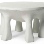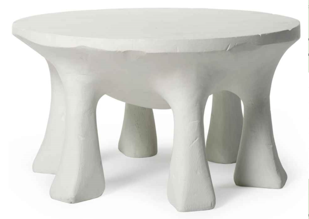 John Dickinson six-legged circular coffee table, dating from the 1970s. This 'African' design features a conical top supported by six stylized legs, inspired by African artistic forms, offering a unique blend of art and function. Constructed from painted plaster over concrete and finished in a sophisticated white, it is robust enough for both interior and exterior use. The design's significance is evidenced by its feature in the New York Times Book of Interior Design and Decoration, illustrated in situ on page 156.