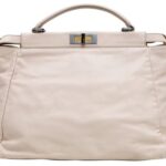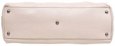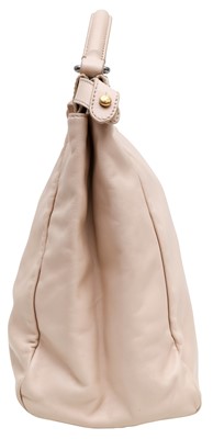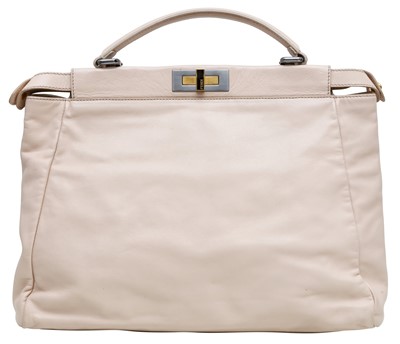 An iconic Large Peekaboo handbag crafted from pale pink leather, representing the peak of Fendi's craftsmanship. The design features a stiff partition dividing two internal compartments, accessible via the signature twist lock on both sides. It is accented with gold-finish hardware, a top handle, and a soft nappa leather-lined interior, embodying a blend of structured utility and luxury.