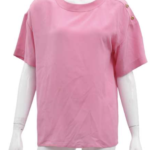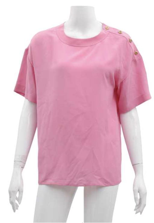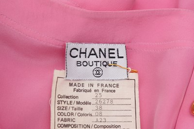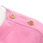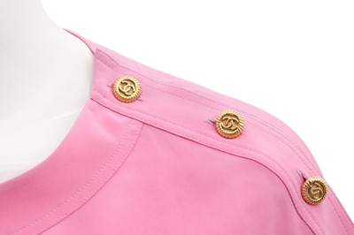 Chanel blouse in a striking bubblegum pink hue, crafted from 100% fine silk. The garment features subtle, tonal CC logo embroidery throughout, maintaining the house's signature branding with an elegant, understated texture. It is designed with a classic fit, button-down front, and refined cuffs, embodying the effortless sophistication of Chanel’s silk separates.