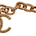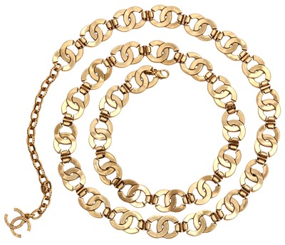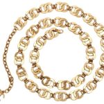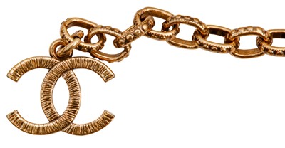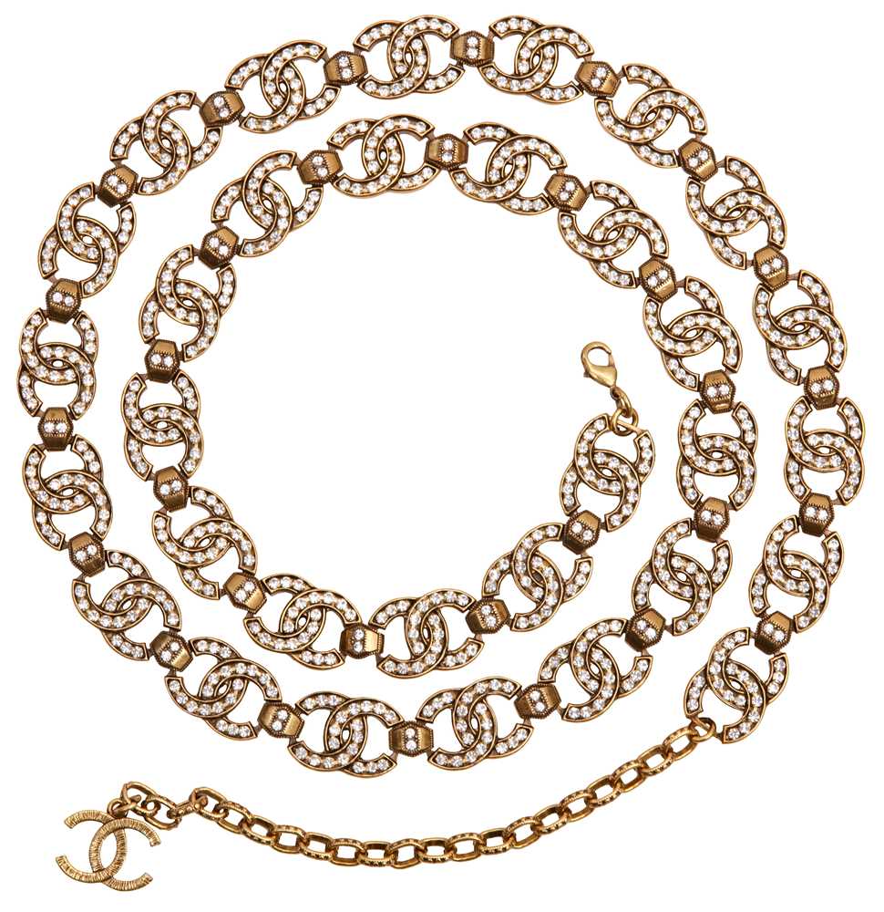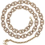 A high-shine ANTIQUE GOLD-tone metal chain belt featuring a central pendant with an interlocking CC motif pavé-set with brilliant-cut crystals. The architecture utilizes a heavy-gauge curb link or cable chain, finished with a classic lobster clasp closure and a crystal-accented hanging charm.