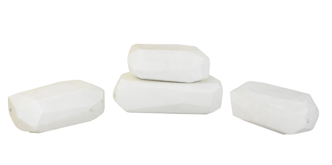 A set of four large, organic-form illuminated sculptures, known as "Rochers" (Rocks), designed by Arik Levy and produced by SERRALUNGA (éditeur). The pieces are constructed from durable plastic, designed to be used both indoors and outdoors. They feature an abstract, rock-like form and are individually signed by the designer.