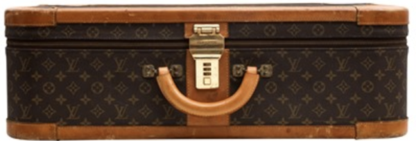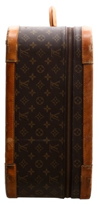 A 70cm Stratos suitcase in monogram coated canvas with natural vachetta leather trim. Features rounded edges, reinforced corners, a double-zip closure, and washable interior lining with luggage straps.