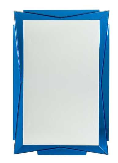 A striking rectangular wall mirror defined by its captivating geometric frame in blue mirrored glass. This architectural border contrasts beautifully with the clear central mirror, creating a dynamic play of light and reflection.Please note: This is a vintage piece with a unique history. Some minor chipping is present, consistent with its age.