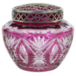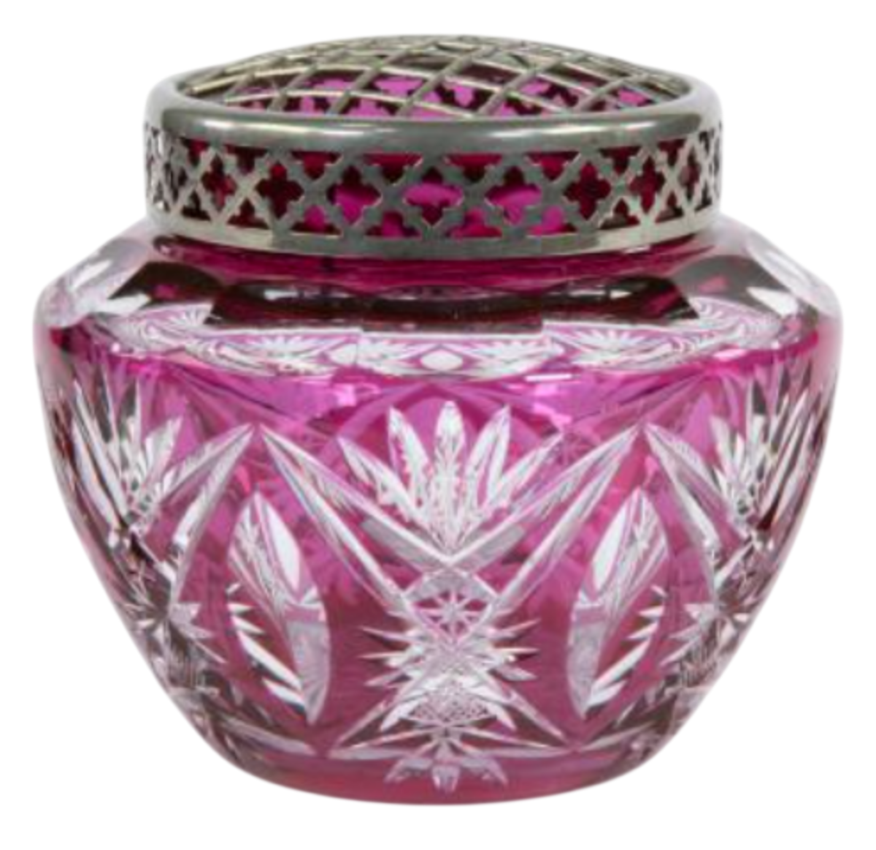 A large and elegant pique-fleurs (or flower frog) designed by Charles Graffart for the celebrated Val Saint Lambert crystal house. The piece features a highly decorative, deeply cut crystal design in a striking combination of purple and clear glass. Graffart's design work helped define the aesthetic of the manufacturer in the mid-20th century.
