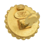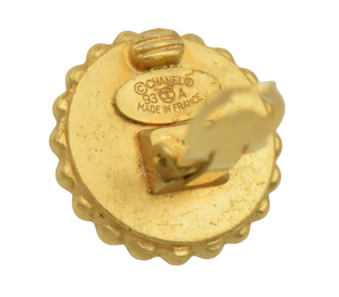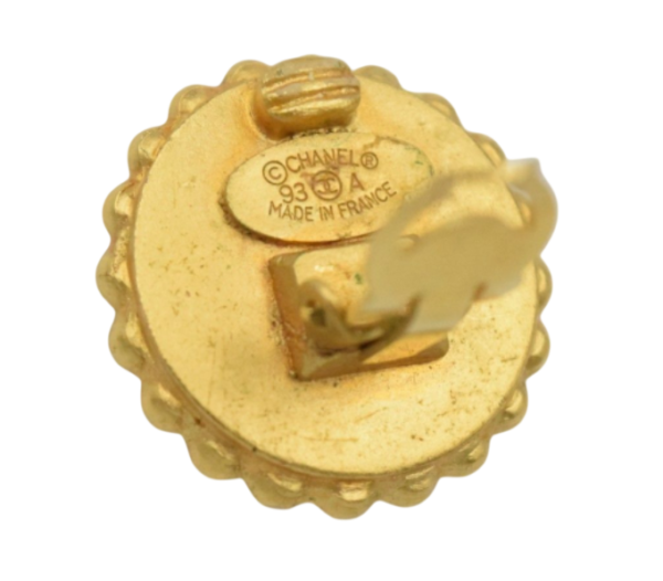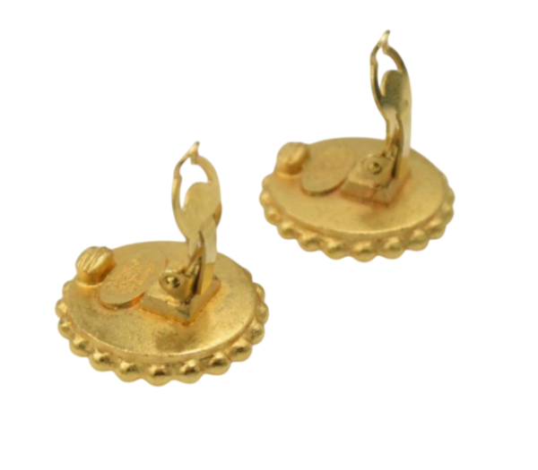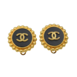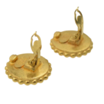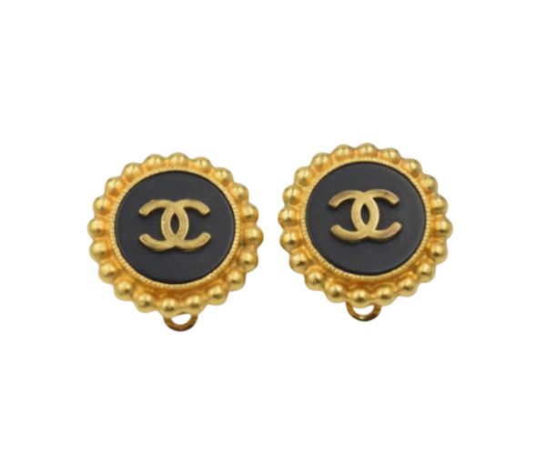 A classic pair of CHANEL circular ear clips. The design features a central hoop decorated with the iconic double CC logo set against a black background, surrounded by a decorative frieze of gilded metal ovals. They are engraved on the back, confirming authenticity.